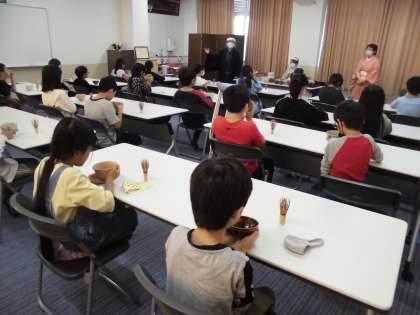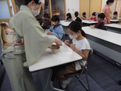 茶せんを置き,茶わんの持ち方や飲み方を教えていただき,じっくり味わいました。