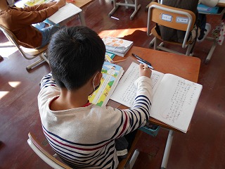 2年の国語科「漢字の広場」では,これまでに習った漢字を使い,主語と述語に気をつけながら作文していました。