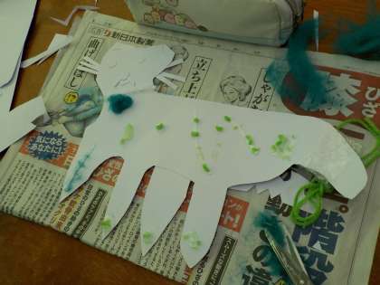 材料の特徴を生かして,版づくりをしました。「プチプチは,たこの足に使えそう。」「ふわふわな素材を使って版を作ったら,仕上がりもふわふわした感じになるかな。」と考えながら作っていました。材料集めのお声かけ,ありがとうございました。