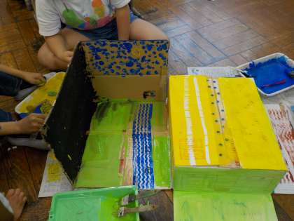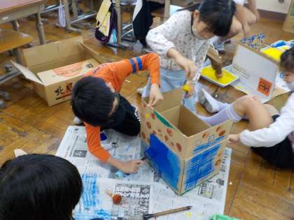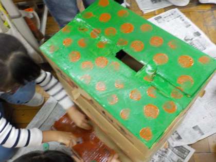 段ボールを開いたりくっつけたり,色を塗ったりスタンピングをしたりして,グループで作品づくりを楽しみました。「秘密基地をつくりました。」「これは,ドールハウスです。」と,他のグループに自分たちが作ったものを紹介していました。