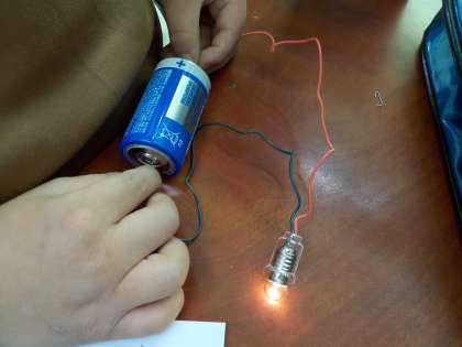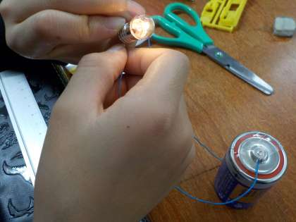また,ソケットなしでも明かりがつくか実験しました。導線の一方は豆電球の端に,もう一方は横につけないとつかないことを知り,びっくりしていました。