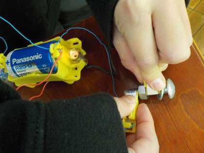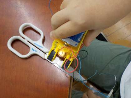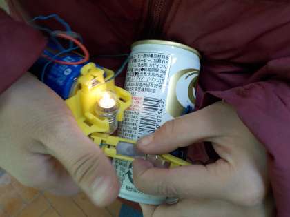 どんなものが電気を通すのか実験しました。はさみの刃やスチール缶,鉄くぎ,1円玉などが電気を通すことが分かり,それらは「金属」だということが分かりました。割りばしやコップ,段ボールなどは電気を通しませんでした。