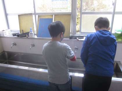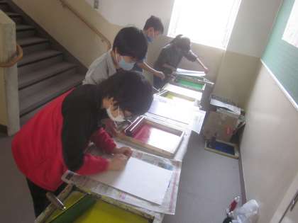 版画の学習が進んでいます。今日は「刷る」作業に入りました。はじめは恐る恐る,でも慣れてくるとテンポよく進めることができていました。教室や使った道具の後片付けも進んで取り組めています。