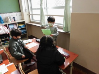 冬休みに「本の木」に書いたおすすめの本を紹介しあいました。感想や質問を上手に言えました。
