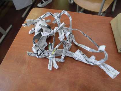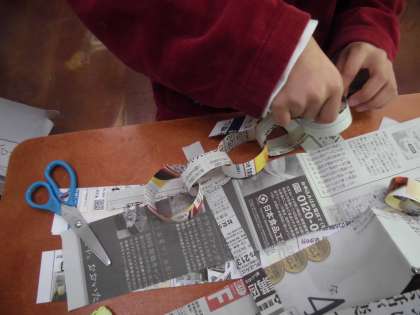 図画工作科の学習では,身近な新聞紙をつかってどんどんつないでできる作品を作りました。