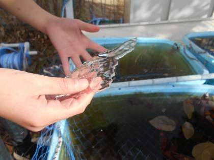 メダカの池を見に行くと,寒さで,うっすらと氷が張っていました。