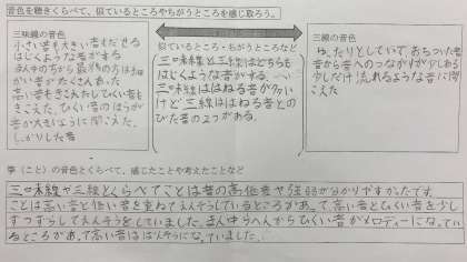 音色の特徴は,「短く切れている」「長くのびている」「いろいろな音が出せる」などがありました。