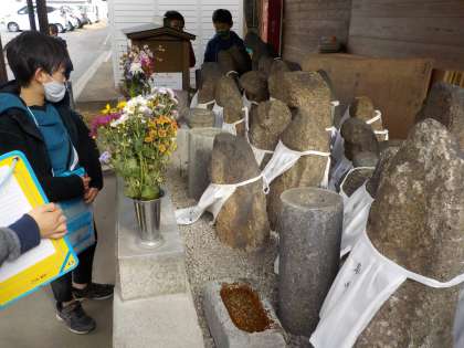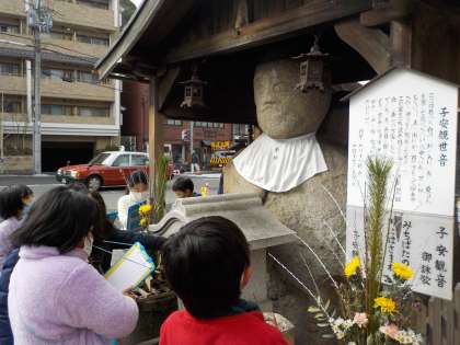 古くから北白川にあるものとして,お地蔵さんを挙げていた子どもたち。北白川子ども風土記には,色々なお地蔵さんのエピソードが載っていました。感動することから,怖いことまで…。調べた後に実際に歩いて実物を見に行きました。「子安観音には本当に焼け跡があった。」「二王は右のお地蔵さんが少し大きかった。」「小さなお地蔵さんは,数を数えた子たちみんな,違う数を言っているから何か不気味だな。何でだろう。」とさらに興味をもっていました。どのお地蔵さんにも,きれいな花が生けられており,きれいな前掛けがかけられていました。そこから,「お地蔵さんは今も北白川の人たちに大切にされている」ということに気づくことができました。