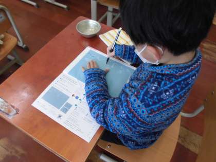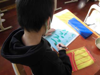 書写の時間に水書筆を使いました。これまで学習してきた「とめ」「はらい」を確かめながら書きました。鉛筆で書くよりも,力の入れ方が難しく,何度も書いて練習しました。