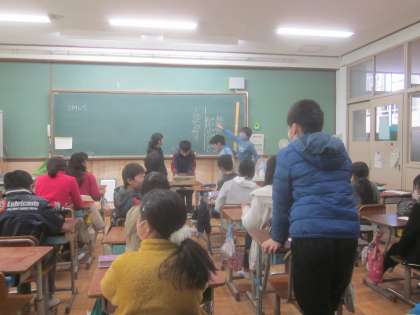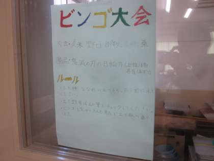 ビンゴ大会をしました。4×4のマスにある数字をチェックしていきます。リーチになった子は立つのですが,途中,ほとんどの子が立っていて,ダブルリーチ・トリプルリーチのオンパレードでした。一人がビンゴになってからは次々とビンゴが出て,あっという間に景品がなくなりました。・・・担任も欲しかったです。