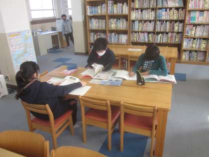 社会科の学習で自然災害について調べます。「地震」「津波」「風水害」「火山」「雪害」のグループに分かれて役割を分担し,本やインターネットで情報を集めています。調べたことは他のグループへ紹介できるように,1人ずつ画用紙にまとめていきます。