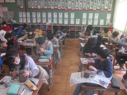 今日は鑑賞の時間でしたが,最後の最後まで自分のおもいを表すために粘土と向き合う姿が見られました。作品作りは3時間取りましたが,時間を追うごとに,集中して取り組むようになりました。作品カードを見ながら,お互いの工夫を見つけていました。