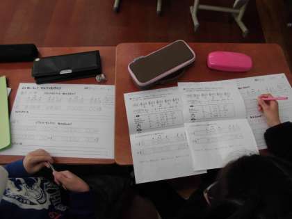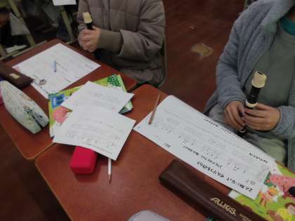 できた旋律をリコーダーの指づかいや小さい声で確かめながら完成させました。