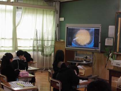 と驚いたようにしている子ども,給食を食べるのを忘れて,じっと動画に見入っている子どももいました。