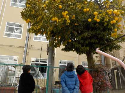 「わたしたちの学校じまん」では,今まで何気なく見過ごしていた学校のいいところを見つけて,友達に伝え合います。学校たんけんに行くと,「このクスノキ,もう100才ぐらいになるんだね。」「わー,美味しそうなグレープフルーツがたくさんできてる。」「あ!これ,北白川子ども風土記に書いてあったやつだ!」と,わくわくしながら学校のいいところをたくさん見つけていました。