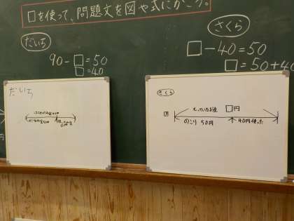 問題文に沿って,分からない部分を□に置き換えて式を立てる学習をしました。「□を使うと,どこの部分を求めるのか,わかりやすくなりました。」「似ている文章問題でも,□を使って図に表すと,ちがいがよく分かりました。」と,□を使って表すよさに気づいていました。