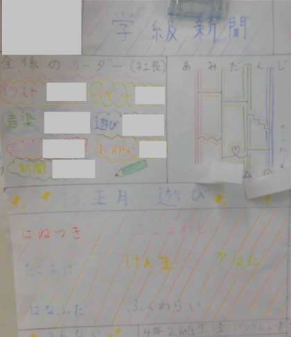 ある係では,学校の様子を新聞にまとめました。新聞には,ラッキーカラー,各係のリーダーさん,クラスの人にインタビューした内容,お正月の遊びなど読んで楽しいものを作っています。