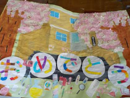 クラスのみんなで「おめでとう」の掲示を作りました。どんな絵にしたいか話し合い,桜を切ったり,絵を描いたりして協力して作り上げました。6年生が喜んでくれたらいいな,と思います。