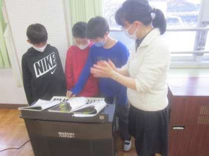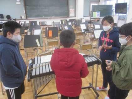 音楽の時間に旋律作りをしています。グループで旋律を決め,順番に演奏していきます。グループごとにいろいろな組み合わせがあり,聞いていても見ていても楽しいです。子どもたちで教え合い,できるようになっています。