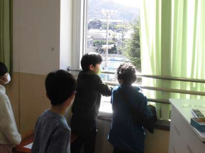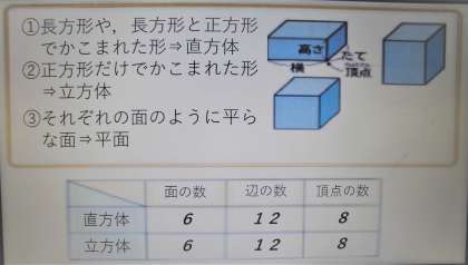 また,身の回りには,どんな直方体や立方体があるのか,教室や廊下を見まわしたり,窓を開けて運動場を眺めたりしてその形を探しました。