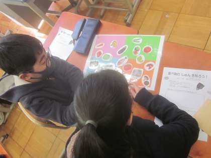 今日は旬の食べ物についての授業がありました。旬の時期には安くて栄養価が高くなることを知り,どの食材がどの季節の食べ物なのかを考えました。旬について知るためには,実際に目で見る,宣伝を見る,調べるなどのアイデアが出ました。生活の中で使ってみてほしいと思います。
