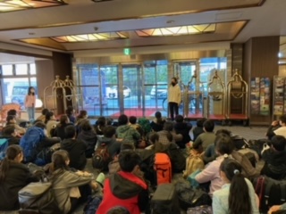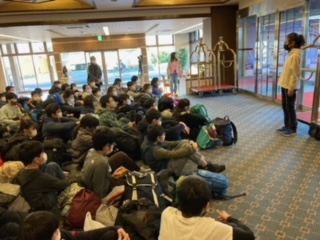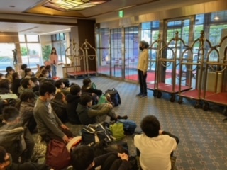 退館式を行いました。代表の児童が感謝の気持ちを伝えました。みんなも、「ありがとうございました。」と挨拶して旅館をあとにしました。