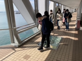 大鳴門橋遊歩道「渦の道」の散歩を楽しみました。海面から45m、潮風を感じながら歩く450mの海上散歩は、迫力満点でした。