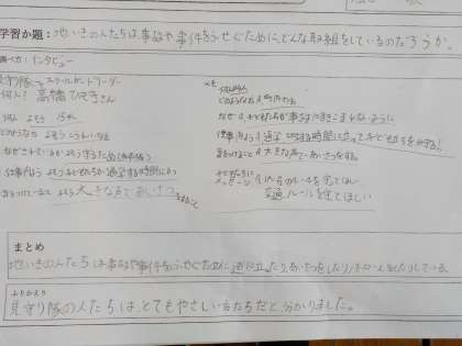 地域の人たちは,事故や事件をふせぐために,どんな取り組みをしているのかを調べました。見守り隊の方にインタビューをしたビデオを見てメモをしました。「こんな大変なお仕事をボランティアでされるなんて,すごいなぁと思った。」「これからは大きな声であいさつをしたいと思います。」「安全に気を付けたいと思います。」と感想を述べていました。