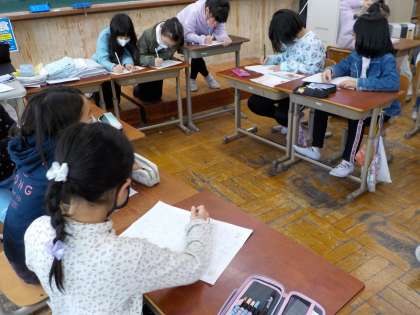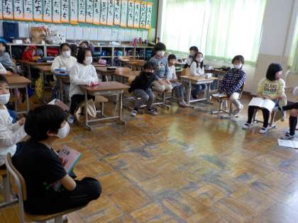 作文の宿題で書いてきた「大根とトマトはどちらがおいしいか。」について話し合いました。「大根は,加熱しても冷たくてもおいしいです。」「トマトは色々な種類や形があって,見た目もおいしそうです。」などと,意見を交わしていました。これから少しずつレベルアップをしていきます。