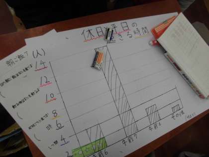 そこから,アンケート結果をもとに資料を作り,どんなことが分かったのか考えています。
