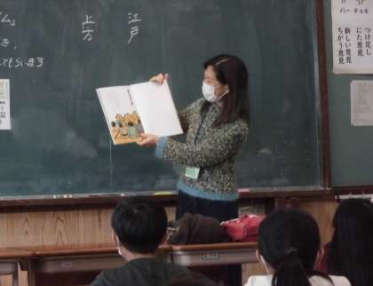 (写真は,4年2組で「まんじゅうこわい」を読んでいただいたものです。)