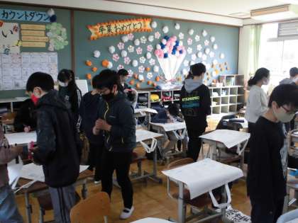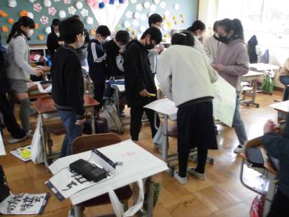 その前に,作品バッグを渡したのですが,「先生,作品バッグにみんなからサインがほしいです!」ということだったので,自分の作品バックに,クラスの友達のサインや一言メッセージを書く時間になりました。