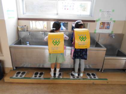 学校に来たら,まず手を洗ってから教室に入るように声をかけていましたが,声をかけなくても自分から手を洗うようになってきました。お兄さんお姉さんが「手を洗うよ」「こっちやで」など,新1年生に声をかけるすてきな場面もよく見かけます。