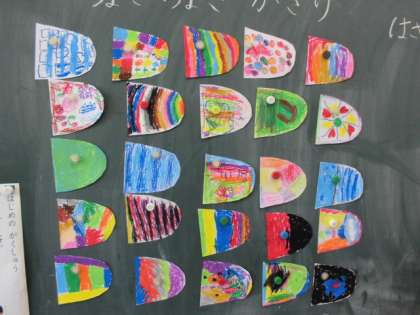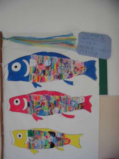 1組さんと一緒にこいのぼりを作りました。こいのぼりのうろこを一つ一つていねいに塗り,1組さんが貼ってくれました。廊下に飾られたこいのぼりを見るたびに,「きれいだな。」「これ,ぼくが作ったやつだ!」と,うれしそうに見ています。