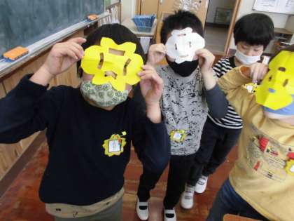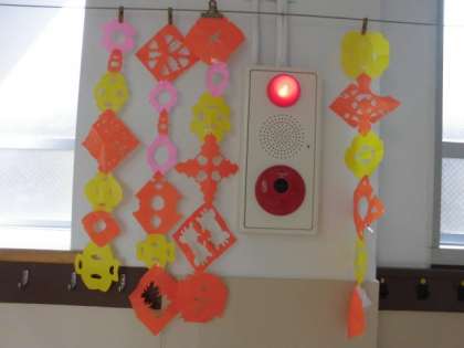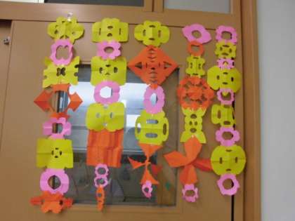 はさみを使う時に大事なことを確認して,切り紙を作りました。三角や四角の折り方をして,印をつけたところを切って広げると,あら!すてきな模様!「きれいなもようになったよ。」「同じ切り方をしたのに,みんなちょっとちがっていて面白いね!」と,出来上がった作品を楽しんでいました。教室や廊下に飾っています。