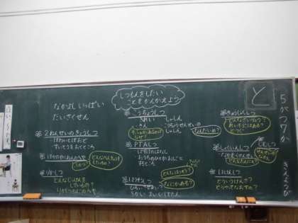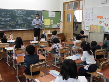 2年生と一緒に学校探検をして,気が付いたことや初めて知ったこと,もっと聞いてみたいことを交流しました。「給食室の中に入って,大きなお鍋を見てみたいな。」「食材を入れる冷蔵庫はどれだけ大きいんだろう。」「校長室には,たくさんの写真が飾ってあったよ。今の校長先生は何代目かな。聞いてみたいな。」と,たくさんの質問が出ました。ちょうど,学習をしている時に,教務の中村先生が見に来られたので,中村先生に質問したいことが聞けました。「中村先生はどんなお仕事をされているのですか。」と,みんなで丁寧な言い方で聞きました。