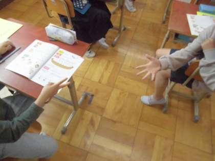 "Rock, scissors, paper, one, two, three!"の掛け声でじゃんけんをして,勝った回数を英語で教えてくれました。