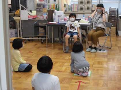 保健室で聴力検査をしました。先生から検査の仕方を教えていただき,静かに検査を受けていました。