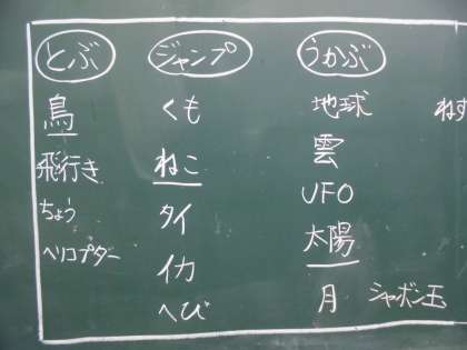 子ども達からは,とぶ,うかぶ,ジャンプする,泳ぐなどをキーワードにしてたくさんの意見が出てきました。