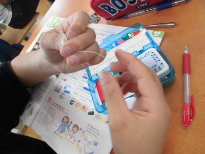 授業の最後に,1分間で何回糸を針に通すことができるかという挑戦をしました。