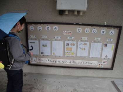 正門を通ると,「こころのけいじばん」があり,それぞれの学年が学習したことが掲示されています。雨の中,足を止めて見ている子がいました。1年生は,「ぞうさんとおともだち」で学習したことを掲示しています。