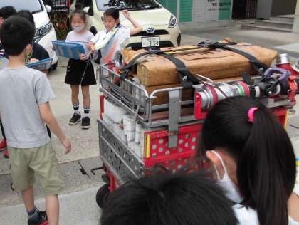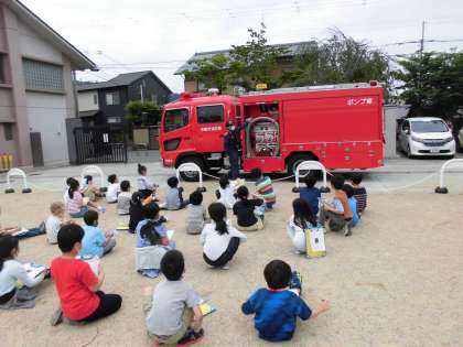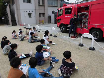 その際,なんと3年生にポンプ車についてお話をしてくださいました。