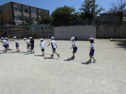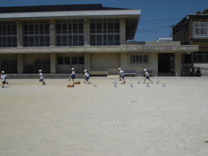 「とびあそび」の学習の最後には,学年みんなで運動場全体を使って,サーキットあそびをしました。フラフープの中をとんでいったり,川に落ちないようによけていったり,ミニハードルやゴムをとんでいったり…上手にまわっていっていました。