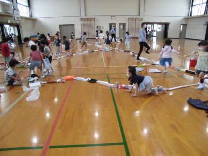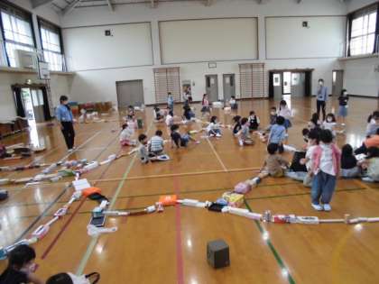 最後は,みんなの箱をひとつにつなげてみました。「わー!線路みたい!電車が通りまーす!」「やったー!2組と3組と4組がつながったぞー!」と,大きな作品が出来たことを友達と一緒に喜んでいました。