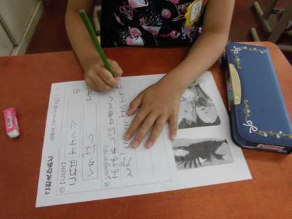 「くちばし」では,本で生き物を調べて,自分でクイズを作ります。問いと答えがあることや,体の説明が書かれていることなどをみんなで押さえ,クイズを作る練習をしています。