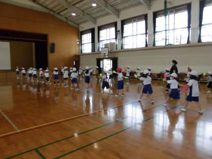 今日の体育科の学習では,北白川スポーツの日の練習をしました。今日からカラー軍手を着けて振り付けの練習をしました。