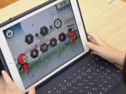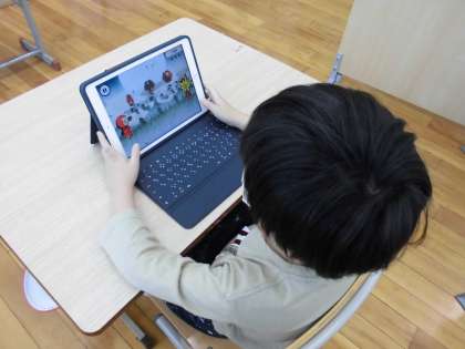 1組のタブレット学習は,iPadを使って学習しています。ゲーム感覚で楽しく学べるアプリを使って,学習意欲を持続できるようにしています。