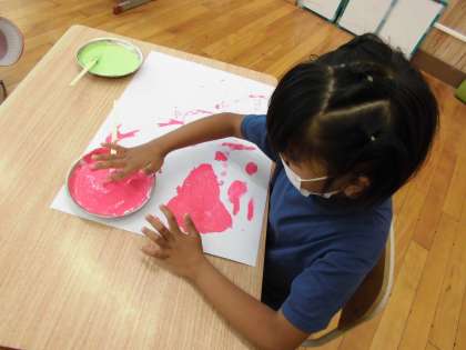 今日の図画工作は,「とろとろえのぐ」の学習をしました。割りばしを絵筆がわりにしたり,指や手のひらを使って,おもいおもいの絵を描いていました。
