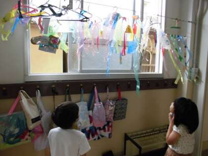 みんなの作品を窓に飾ると,風に揺れてとてもきれいです。「風に揺れるとこんなふうになるんだね。」と,風に揺れて作品の姿が変わることを楽しんでいました。