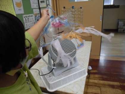 作った作品をファンの近くに持っていき,みんなの前で発表しました。「私は,チョウを作りました。」「僕は,流れ星を作りました。」と,みんなの前で作品を見せていました。